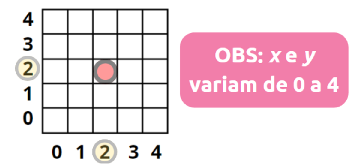 A BitDogLab possui 25 LEDs dispostos em 5 linhas por 5 colunas. Para orientação, vamos nomear cada LED através da sua posição (coluna versus linha) ou então (x, y) onde x indica a posição horizontal identificando a coluna e y a posição vertical, identificando a linha.